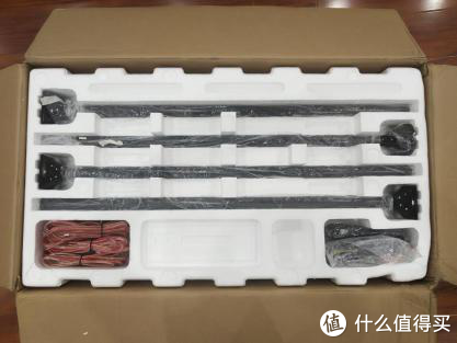第一層泡沫板上是配件:四根支架、音箱線、電源線、遙控器、說明書等。