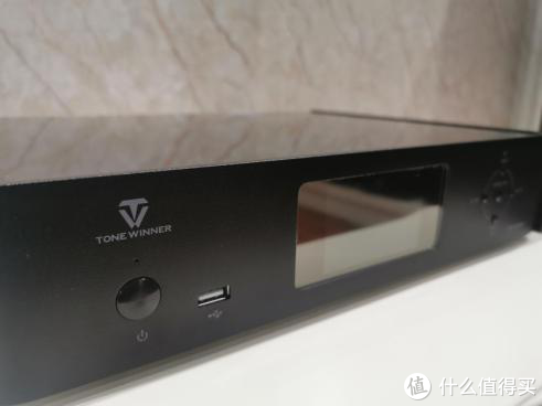 功放也是金屬材料,全黑色,前板和側(cè)板由一體的磨砂質(zhì)感的金屬鑄成,中間嵌著一塊顯示屏。頂部是一塊光滑的鏡面板,能清楚地倒映出周圍的物體。