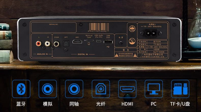 除了前面講到的TF卡/U盤本地播放接口外,TY-B03還支持模擬、同軸、光纖、HDMI等接口,可連接電視、音樂(lè)、游戲機(jī)等設(shè)備。