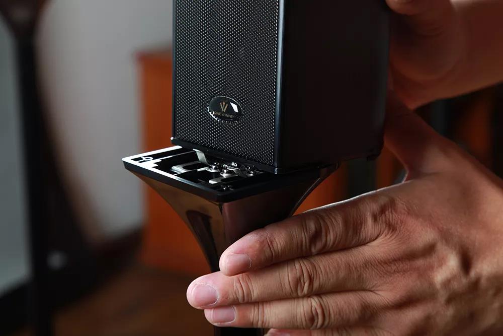 悠享一號采用獨特的接線方式,光是音箱腳架的設計已獲得了九項外觀專利技術!用戶只需將喇叭線接到音箱底盤,再連接底盤和支撐桿,再將音箱輕輕推進支撐桿頂部卡扣位即可。這樣的連線設計,即不占空間,將揚聲器放在角落,又為用戶減少了繁雜的布線,一舉兩得。豪華版的環繞音箱,采用無線傳輸方式,環繞箱無需再拉長長的音箱線,即可實現5.1.4系統帶來的震撼音效。