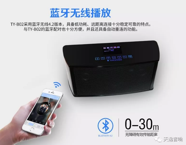 【支持無(wú)線藍(lán)牙傳輸】TY-B02采用了先進(jìn)的藍(lán)牙4.2配置,該藍(lán)牙芯片支持?jǐn)?shù)字音頻輸出。相比普通藍(lán)牙版本,藍(lán)牙4.2版本在信號(hào)傳輸方面更加穩(wěn)定、距離更遠(yuǎn),藍(lán)牙回鏈的速度也更快,而且功耗更低。在與該音箱的藍(lán)牙配對(duì)時(shí)十分方便,且內(nèi)置了自動(dòng)重連功能,免除了用戶反復(fù)操作的煩惱。