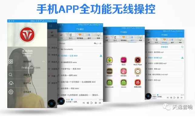 【APP配置】除此以外,強(qiáng)大的TY-B02還配備手機(jī)APP!這是天逸專為高保真數(shù)碼產(chǎn)品開發(fā)的專用APP,版面簡(jiǎn)潔、功能實(shí)用、操作簡(jiǎn)單,是一款人性化的設(shè)計(jì)。(PS:用戶只需關(guān)注微信公眾號(hào):天逸音響,點(diǎn)擊底部菜單【服務(wù)支持-APP下載】即可獲取安裝。)APP和音箱之間通過(guò)藍(lán)牙進(jìn)行連接,它可以讀取手機(jī)預(yù)設(shè)的音樂(lè)APP,從而播放手機(jī)本地歌曲;通過(guò)它用戶可以管理跟音箱連接播放設(shè)備,自由地切換音源,以及控制音箱的音量大小等操作。如此方便簡(jiǎn)單的操作對(duì)于用戶來(lái)說(shuō)無(wú)疑是一大福音。