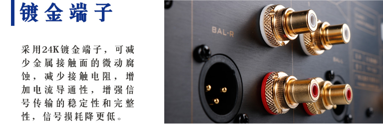 TY-1CD的輸出接口均采用24K鍍金端子,能減少金屬接觸面的微動(dòng)腐蝕,進(jìn)而減少接觸電阻,增加電流導(dǎo)通性,同時(shí)能有效增強(qiáng)信號(hào)傳輸?shù)姆€(wěn)定性和完整性,降低信號(hào)傳輸中產(chǎn)生的衰減值,避免高衰減值給高低頻信號(hào)帶來(lái)的不穩(wěn)定,將信號(hào)損耗降到最低。
