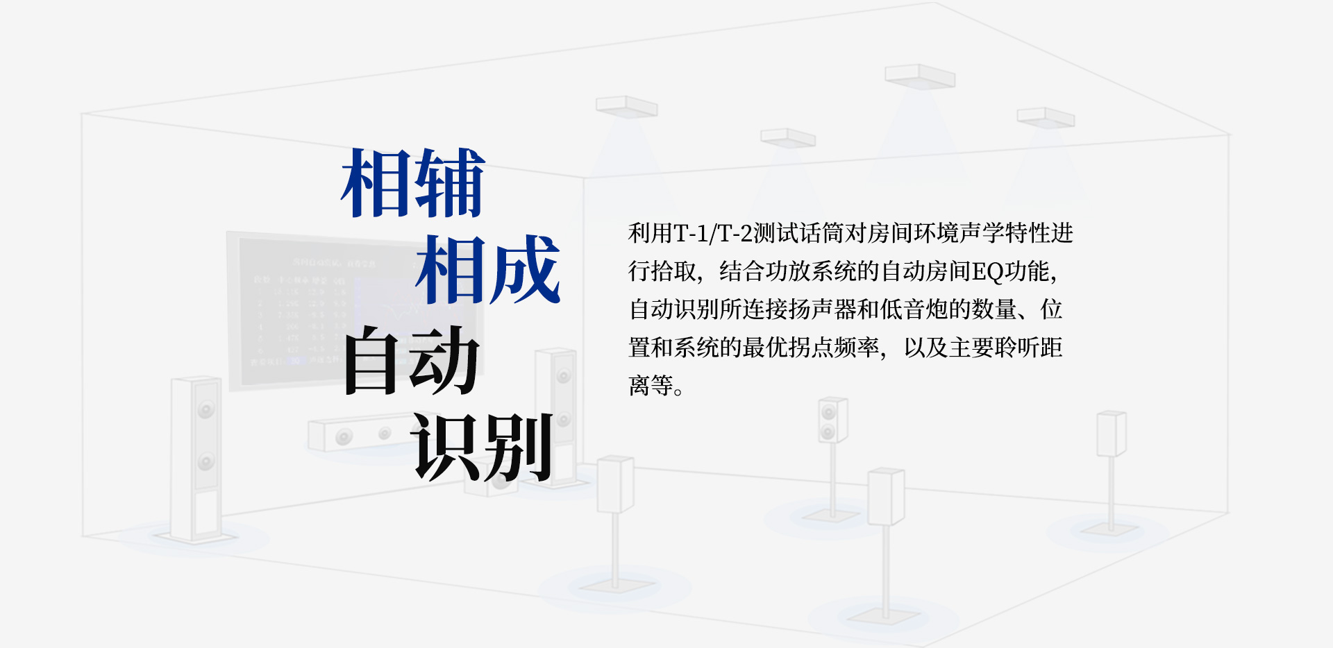 T-1/T-2是天逸家庭影院系列的專業級聲學測試話筒。搭配功放自帶的自動房間EQ功能,在自動識別音響系統狀況后進行自動聲場校正,獲得更精準的音頻定位。