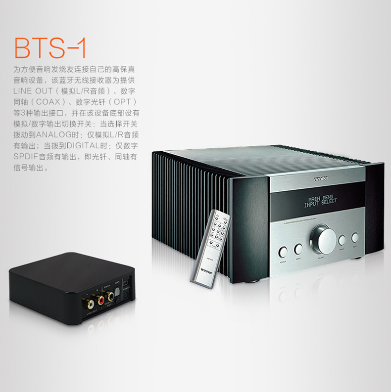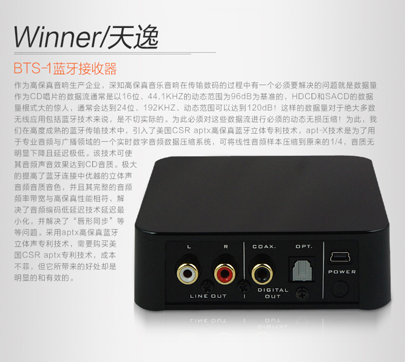 二、外觀特點 本BTS-1藍牙接收器為獨立的黑匣子結構,盒子采用黑色高亮鑄塑工藝,細節上非常精美養眼。信號接口齊全,使用連接方便,操作簡單快捷,是專門為高保真音頻功放及家庭影院系列產品配套的無損壓縮藍牙3.0音頻傳輸接收設備,由于采用了高科技的藍牙高保真傳輸的APTX專利技術,可將線性音頻樣本壓縮到原來的1/4,而音質無明顯下降且延遲低(無壓縮音頻使用1.411Mbps帶寬實現CD品質),并且可以輸出SPDIF數字信號、以及立體聲模擬音頻信號,尤其采用光纖或同軸數碼線輸出信號為SPDIF數字信號時的聲音效果尤佳!比立體聲模擬音頻信號好出一大截!的確可以媲美CD機播放原版CD碟的音質音色!比一般藍牙傳輸音頻有更好的音質音色效果,是眾多高保真音響獲得數字音頻信號源及手機歌庫實現高保真藍牙音樂播放不可或缺的利器。