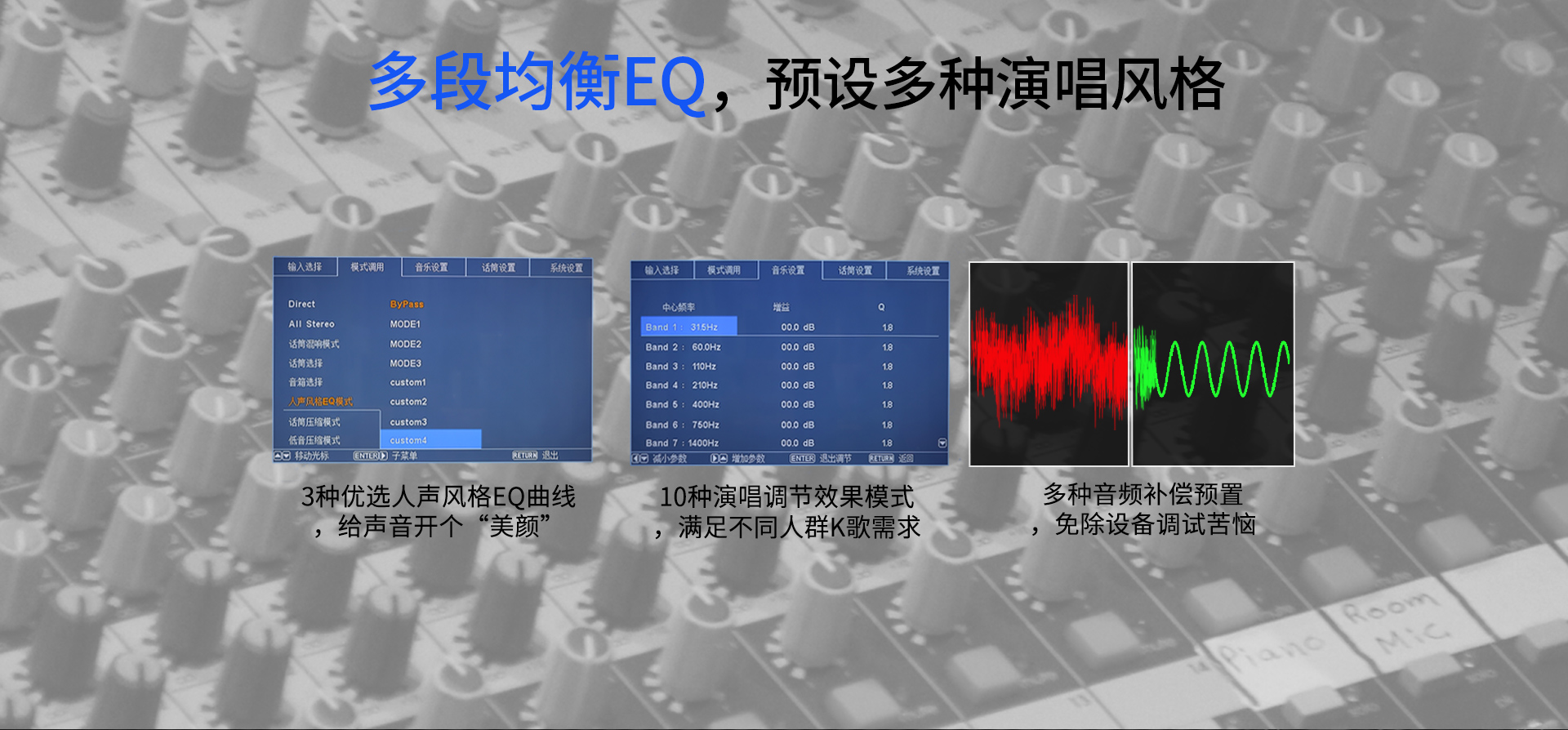 | 信噪比:音樂: >90dB(A計權) 話筒: >85dB(關閉噪聲門,A計權) | 頻響范圍:20Hz~20KHz (+1/-3dB) |