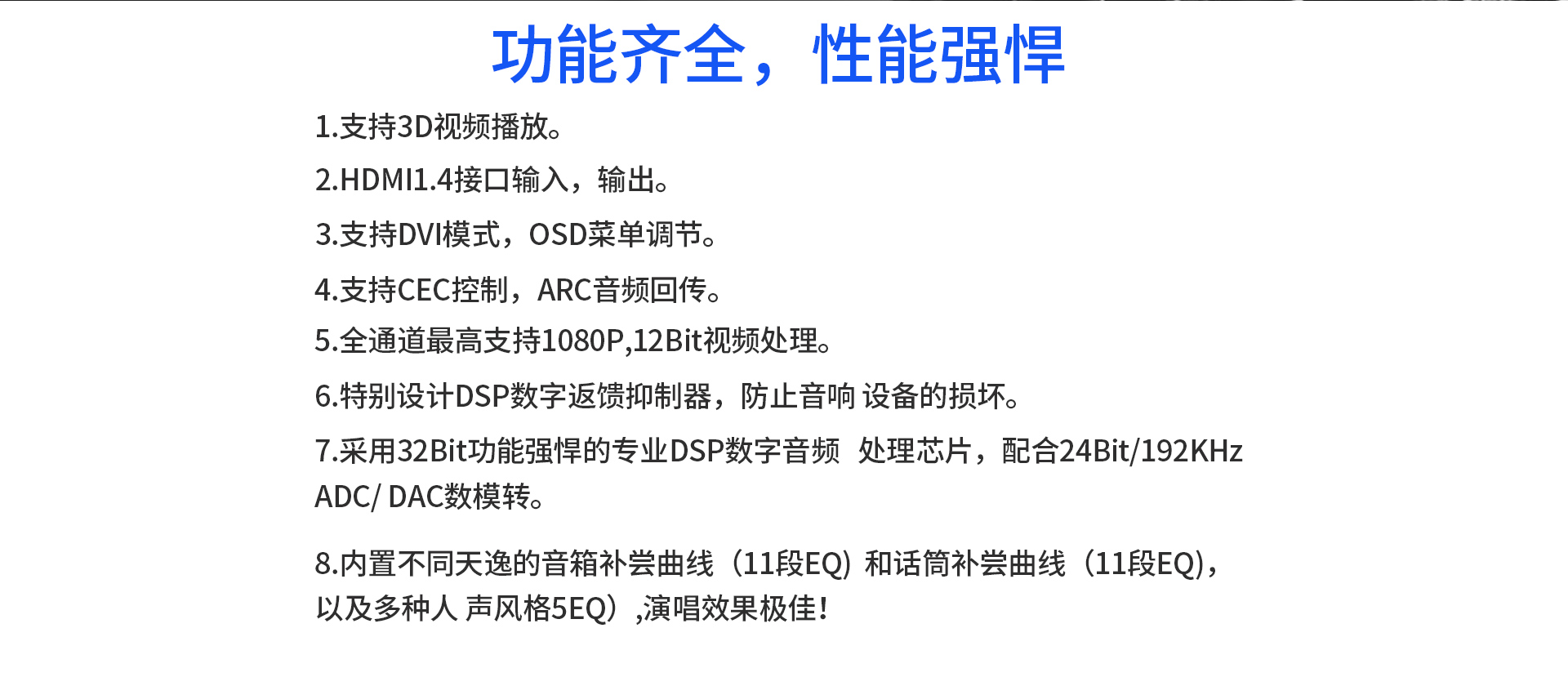二、功能特點 1. HDMI1.4接口輸入,輸出。 2. 支持3D視頻播放。 3. 支持CEC控制,ARC音頻回傳。 4. 全通道最高支持1080P,12Bit視頻處理。 5. 支持DVI模式,OSD菜單調節。 6. 采用32Bit功能強悍的專業DSP數字音頻 處理芯片,配合24Bit/192KHz ADC/ DAC數模轉。 7. 內置不同天逸的音箱補嘗曲線(11段EQ) 和話筒補嘗曲線(11段EQ),以及多種人 聲風格5EQ),演唱效果極佳! 8. 特別設計DSP數字返饋抑制器,防止音響 設備的損壞。