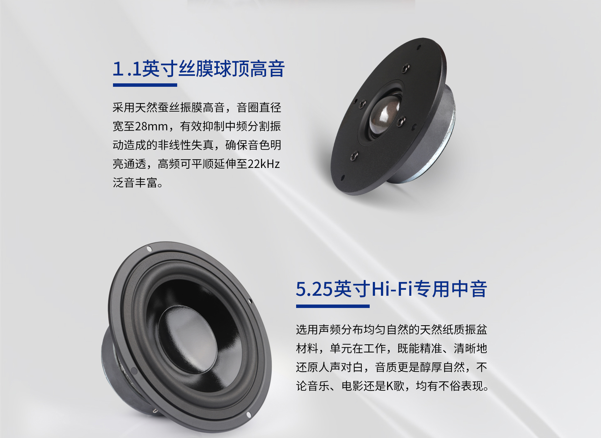 二、主要功能表述 TD-10高音采用28芯透明絲質振膜,音色明亮通透,高頻的延伸非常到位,并具有很高的功率承受能力,能經受家庭影院超強功率的考驗而且失真極小。 中低音單元,選用了聲頻分布均勻自然的天然振盆材料并在其上壓覆有一層高阻尼膠和天然礦物的混合材料,不僅內阻尼相當理想,強度也大大提高,失真更低,瞬態更好,音質也特別細膩甜美。 低音采用一體鑄鋁盆架低音。