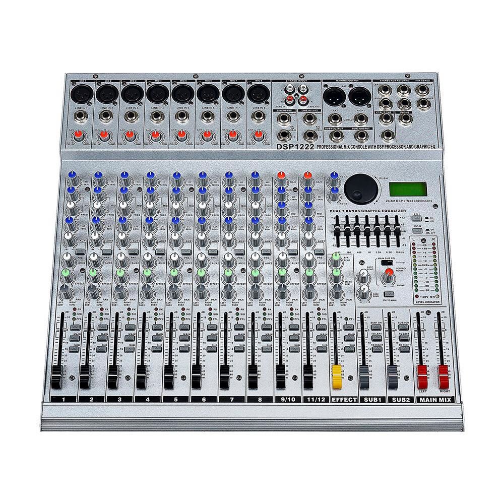 DSP1222調(diào)音臺(tái)功能概述 一、主要特征1、 8路話筒輸入,4路(2組)立體聲輸入,帶48V幻像電源 2、輸入高中低3段均衡,中頻可掃頻 3、兩個(gè)輔助輸出,輔助AUX1可以選擇推子前推子后信號(hào),輔助AUX2為推子后信號(hào) 4、輸入每路帶主輸出MAIN,編組SUB, 監(jiān)聽(tīng)PFL開(kāi)關(guān), 方便選擇每路帶信號(hào)指示燈,監(jiān)聽(tīng)PFL指示燈和峰值指示燈 5、內(nèi)置24-bitDSP數(shù)字效果, 32種效果,效果佳,可與專業(yè)效果器媲美 6、效果模式帶液晶顯示屏,顯示直觀,操作方便 7、兩主輸出,帶平衡和非平衡輸出口,兩個(gè)推子獨(dú)立控制,60mm進(jìn)口推子 8、真正的兩編組輸出,兩個(gè)推子獨(dú)立控制,帶編組開(kāi)關(guān),編組信號(hào)可以疊加到主輸出 9、立體聲監(jiān)聽(tīng)輸出,可以耳機(jī)監(jiān)聽(tīng),也可以外接音箱監(jiān)聽(tīng) 10、兩組立體聲輔助返回,方便外接設(shè)備輸出七段均衡,+/-12dB, 帶直通和均衡開(kāi)關(guān),方便選擇 11、外置大功率電源,提升信噪比 12、標(biāo)準(zhǔn)雙12段光柱電平表,精確指示電平大小,帶撥動(dòng)選擇開(kāi)關(guān),可以選擇指示主輸出,編組輸出,推子前三種信號(hào) 13、獨(dú)特的外觀設(shè)計(jì),SMT表面貼片工藝,性能可靠 14、帶錄音輸出和錄音回放輸入