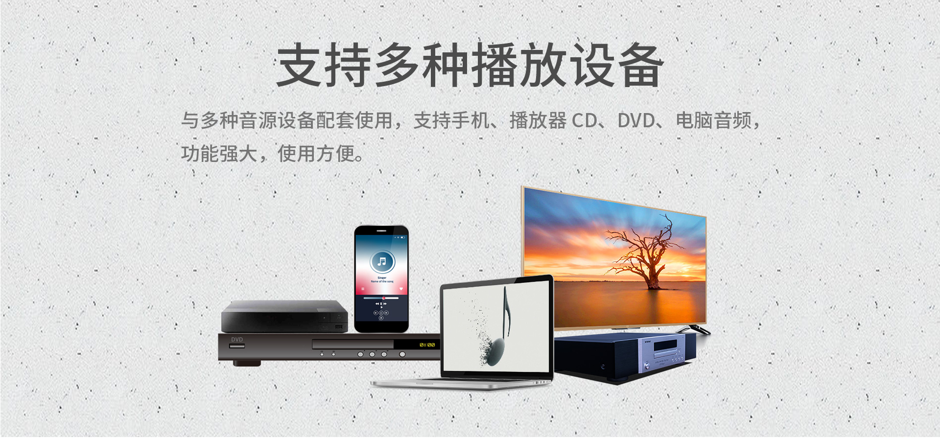 三、主要功能表述 支持多種電視及音響設備,輕松聽您想聽 。同時支持藍牙、光纖、同軸、USB、一路數字音頻信輸入號兩路模擬信號輸入接口,一機多能。能與多種音源設備配套使用,支持手機、播放器、CD、DVD、電腦音頻,功能強大,使用方便。 操作簡單,預置多種音效模式,切換自如。一切的進步,源于對更高生活品質的追求,多種聽音模式可隨心選擇,更有強中弱三種強度選擇一鍵切換,不再為如何調節音效而惱火,聆聽更舒暢!使用更快捷! 給您不一樣聽音驚喜。小體積,大能量。聲音洪亮,音質醇厚,令人驚訝!電影聲場感震撼,脫箱感強烈。 近場聆聽的不二之選、針對小空間聲學環境的悉心調校,能夠近距離聆聽到更多的細節,精準的聲場定位高水平的還原音質。使在小空間內享受音樂的舒適度更加顯露出來。