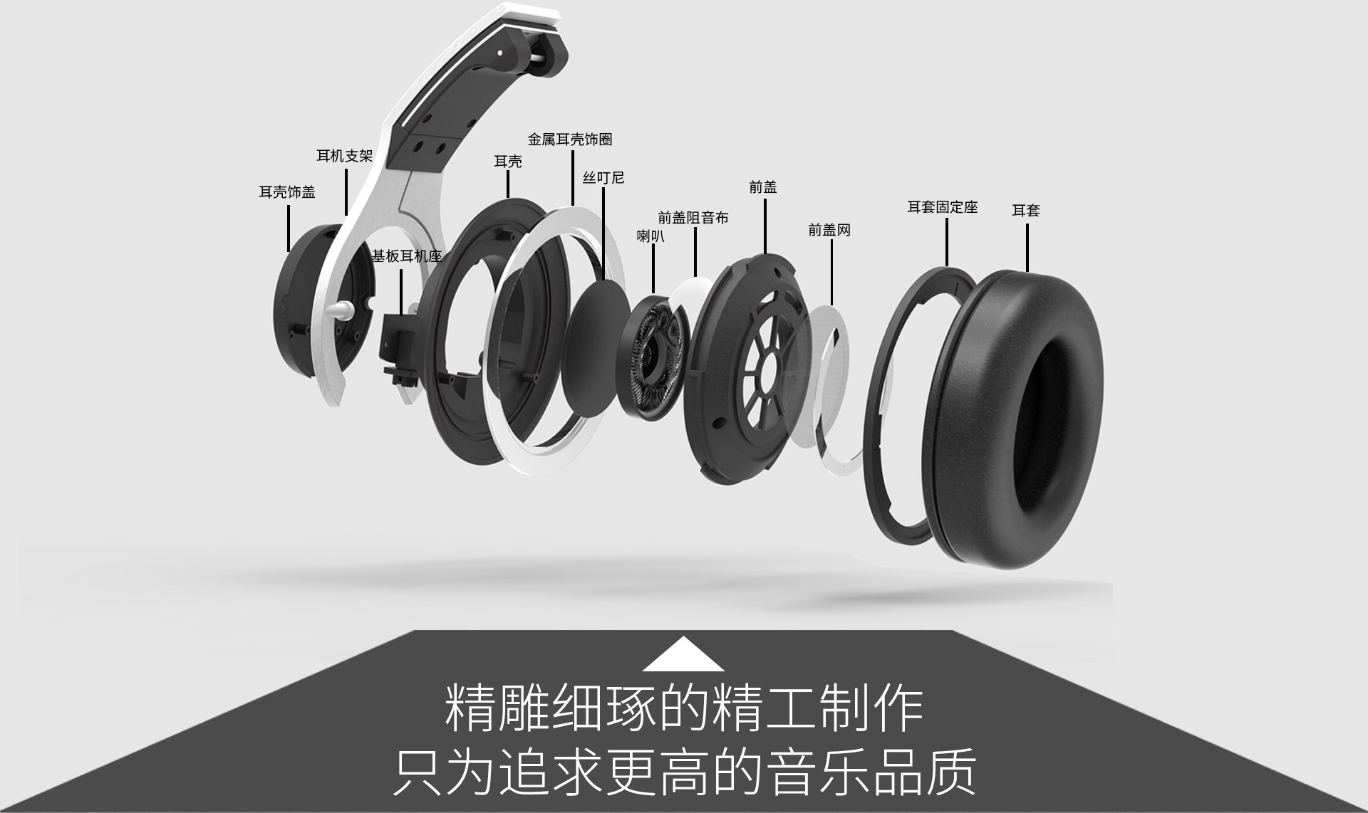 外形設計:頭樑部分采用雅典黑色的PVC材質,高強度韌性頭樑完全滿足了不同頭型佩戴者的需求,頂部鐳射激光雕刻出精致的TONEWINNER商標,時刻彰顯著耳機的出生。頭樑內側鑲嵌著厚達2厘米的減震海綿墊,表層裹覆著做工細膩的仿蛋白皮料,在確保耐用性的同時更能保證與頭部接觸時的舒適度。頭樑部分寬約3.5厘米,寬闊的頭墊能降低長時間佩戴的疲勞感。連接頭樑與耳罩的耳機支架采用貨真價實的鋁合金材質,采用工藝極其細膩的陽極氧化和精細噴砂工藝,讓耳機看起來動感十足!銀白色的耳機支架與雅黑色的頭樑及耳機腔體有機的結合,形成了黑白分明的強烈對比,突出耳機的金屬澤度和厚實質感!