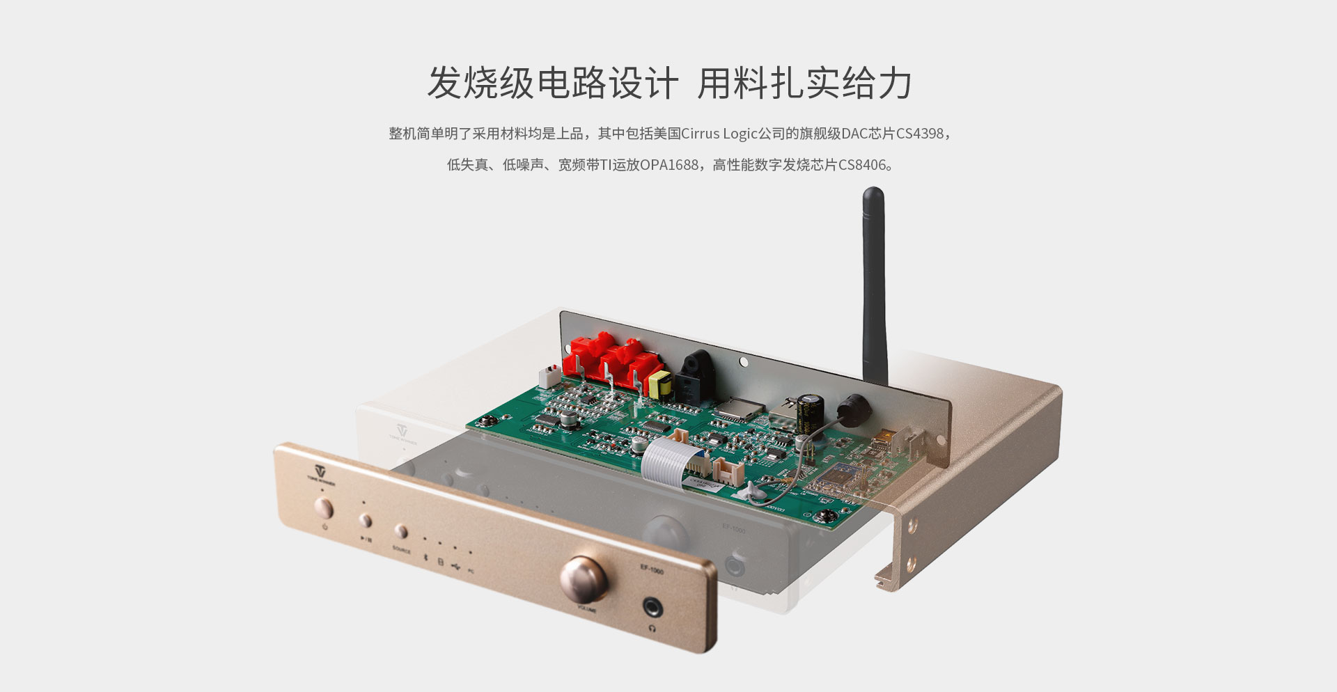 模擬音頻放大電路部分采用TI公司的發(fā)燒級運(yùn)放OPA1688(濾波整形放大),具高增益、低失真、低噪聲、寬頻帶的特色,可為用戶帶來震撼的聽覺享受。高性能數(shù)字發(fā)燒芯片CS8406,依托CS8406內(nèi)部的高精度硬件時鐘分頻電路進(jìn)行信號反饋,進(jìn)一步降低噪聲和失真。 該機(jī)最重要的藍(lán)牙處理芯片采用了炬芯旗艦藍(lán)牙音頻芯片ATS2825。ATS2825是針對中高端藍(lán)牙市場設(shè)計的高性能藍(lán)牙V4.2雙模藍(lán)牙音頻解決方案Soc,高度集成MCU、DSP和RF在一顆單芯片中,體積雖小但內(nèi)功深厚,在保證高品質(zhì)音樂播放的同時仍保持低功耗的特點。 對于音頻設(shè)備而言,也許好聲音并不一定要全歸功于優(yōu)秀的用料,但優(yōu)秀的用料加上設(shè)計師精細(xì)的調(diào)音,是讓音質(zhì)更上一層樓的基礎(chǔ)保證。EF-1000一系列考究的用料可見設(shè)計師的用心良苦,堅持采用發(fā)燒理念和設(shè)計,將HI-FI進(jìn)行到底。