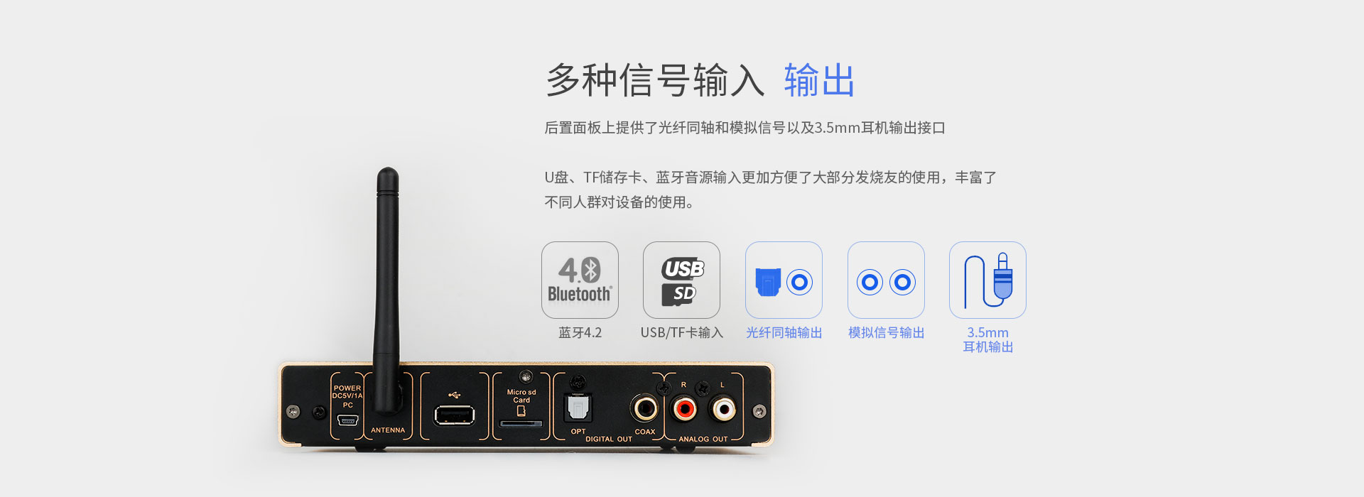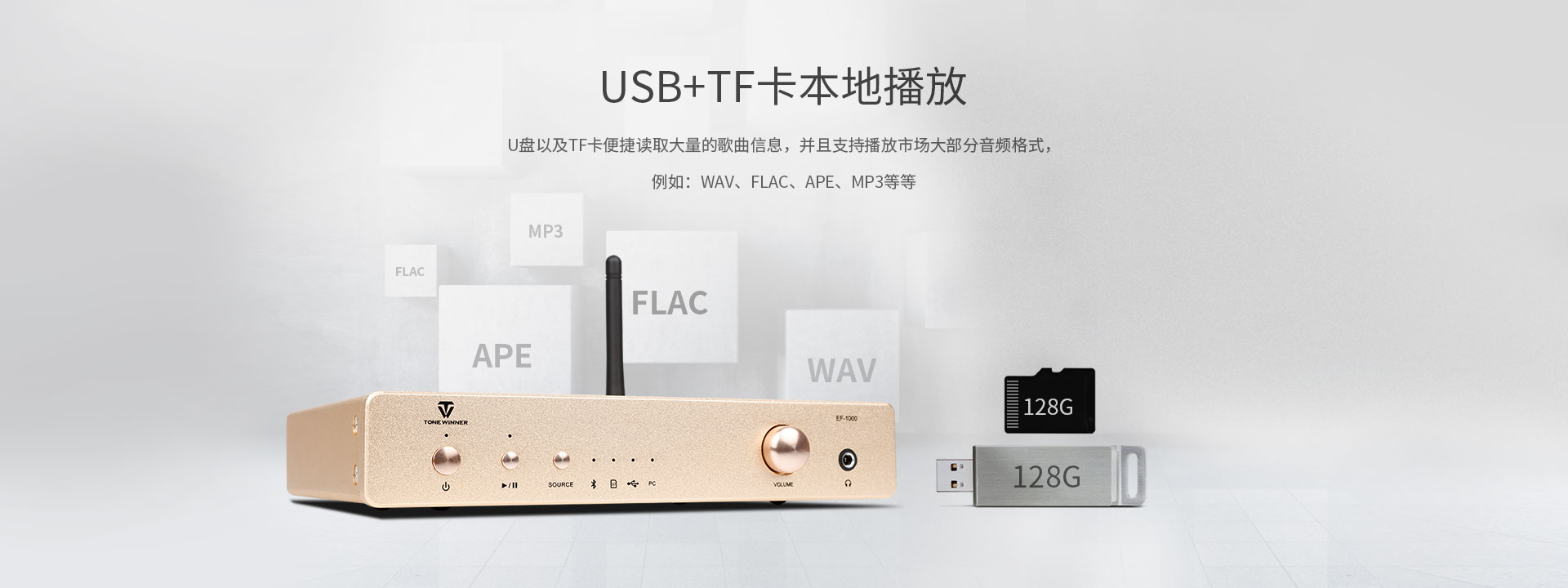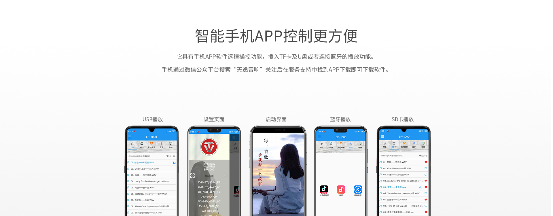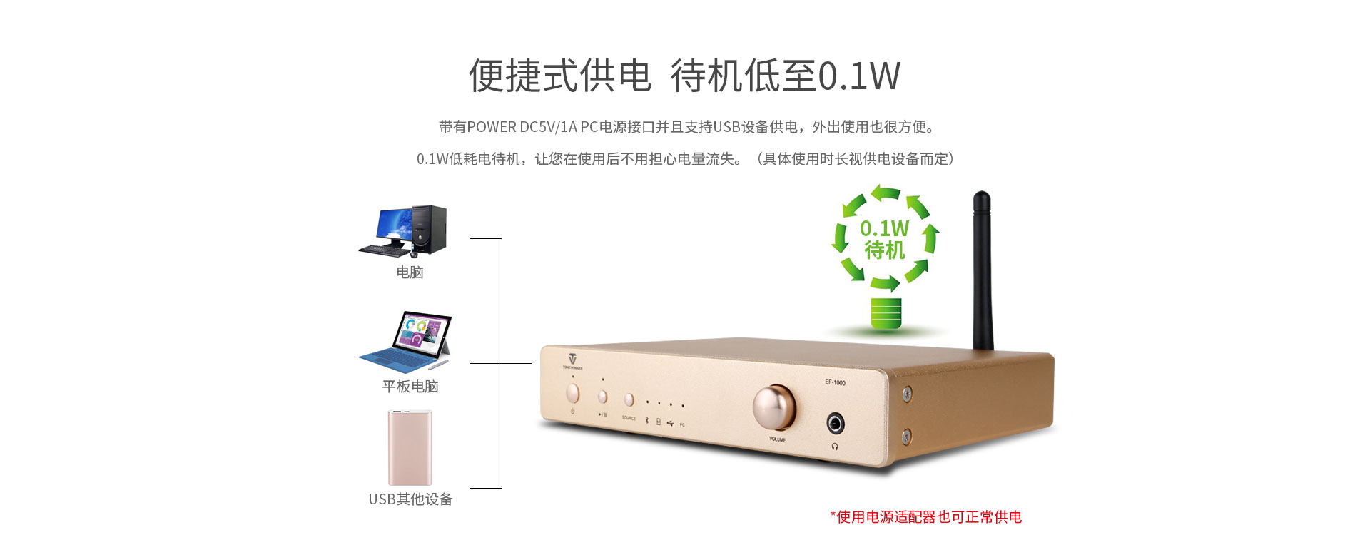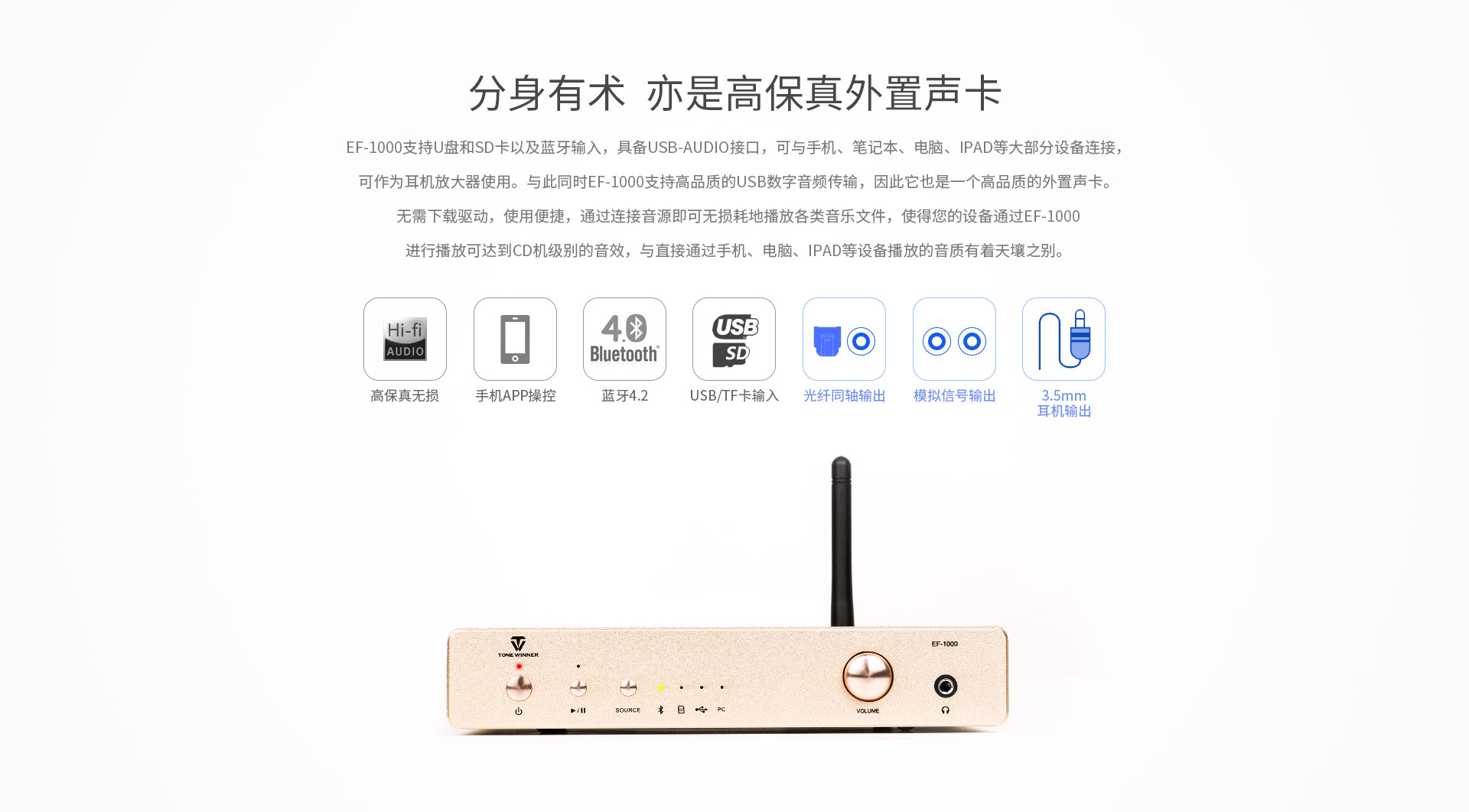 4.細(xì)心的朋友會發(fā)現(xiàn),背板的USB-Audio接口絲印上標(biāo)注的是“POWER DC5V/1A PC”,換言之,此多功能接口不僅可以連接電腦用于數(shù)字音頻傳輸,同時還能同時為EF-1000供電!事實上,除了用PC,用戶還能使用平板、手機(jī)、充電寶等移動設(shè)備進(jìn)行供電!待機(jī)功耗低至0.1W,節(jié)能環(huán)保。如此強(qiáng)大的功能,在便攜性上得到了極好的保障。 5.它也是一款高品質(zhì)音頻解碼器。EF-1000采用HI-FI音頻設(shè)計方案,內(nèi)置旗艦級DAC芯片CS4398,保證超強(qiáng)解析力,聲音溫暖細(xì)膩,富有情感,細(xì)節(jié)表現(xiàn)出色。因此它完全可以被用作一個高級音頻解碼器前級與Hi-Fi后級功放匹配。 6.它同時也是一款耳機(jī)放大器。EF-1000有一個3.5mm耳機(jī)插孔,采用經(jīng)典的HI-FI放大電路,對耳機(jī)有較強(qiáng)的驅(qū)動力,能匹配16Ω~300Ω的各種耳機(jī),并讓其展現(xiàn)出極佳音效。 7.它更是擁天逸自主研發(fā)的具有強(qiáng)大功能和便捷操作的手機(jī)APP系統(tǒng)。EF-1000配備天逸音樂APP,兩者之間通過藍(lán)牙進(jìn)行連接,APP可以讀取手機(jī)預(yù)設(shè)的音樂,從而播放手機(jī)本地歌曲;且可以管理跟連接播放設(shè)備,自由地切換音源。EF-1000還有完善的文件管理系統(tǒng)和我的最愛歌曲收藏功能,通過APP操作,可顯示TF卡或U盤內(nèi)8層文件或歌曲名以及其文件路徑,并可一鍵添加至“我的最愛”收藏內(nèi)。如此方便簡單的操作對于用戶來說無疑是一大福音。