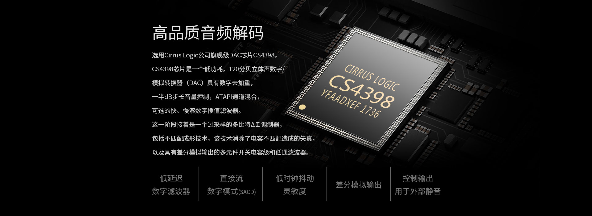 二、電路及用料設(shè)計 EF-1000采用發(fā)燒級電路設(shè)計,精選各種高品質(zhì)器件,它的數(shù)字音頻解碼芯片選用Cirrus Logic旗艦級DAC芯片CS4398,該芯片是一個完善的立體聲24Bit/192K Hz數(shù)字至模擬(D/A)轉(zhuǎn)換系統(tǒng),具有120dB以上的信噪比和動態(tài)范圍,總諧波失真+噪聲低至0.0005%,是一枚非常發(fā)燒的、常見于中高檔CD機(jī)上的D/A轉(zhuǎn)換器。