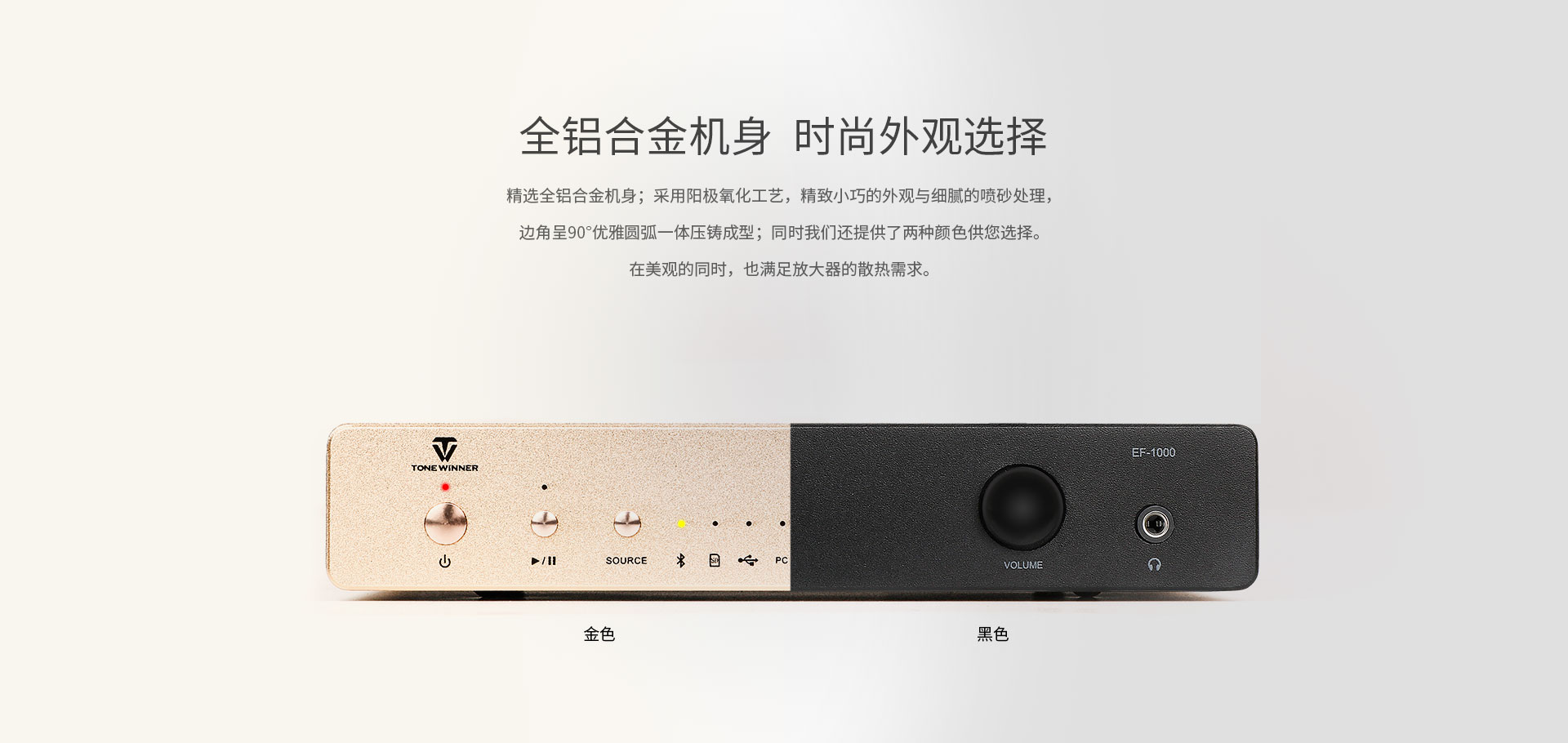 一、外觀特點 EF-1000外觀精致便攜,有香檳金、典雅黑兩色可選。精雕細(xì)琢的全鋁合金機(jī)身,不僅時尚美觀且有利于整機(jī)散熱;面板采用陽極氧化工藝與極其精細(xì)的噴砂處理,不褪色;優(yōu)雅圓弧棱角設(shè)計一體成型,美觀大氣且手感極佳。