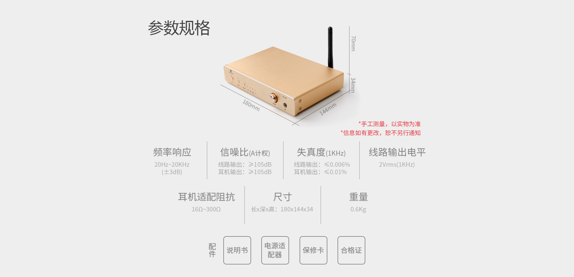 五、產(chǎn)品主要性能指標(biāo) 信噪比:線路輸出:≥105dB;耳機(jī)輸出:≥105dB(±3dB) 頻率響應(yīng):20Hz~20KHz 失真度:線路輸出:≤0.006%;耳機(jī)輸出:≤0.01%(1KHz) 線路輸出電平:2Vrms(1KHz) 耳機(jī)適配阻抗:16Ω~300Ω 待機(jī)能耗:0.1W 凈重:0.6Kg 整機(jī)尺寸:180×34×144mm(寬×高×深) 配件:說明書、電源適配器、合格證