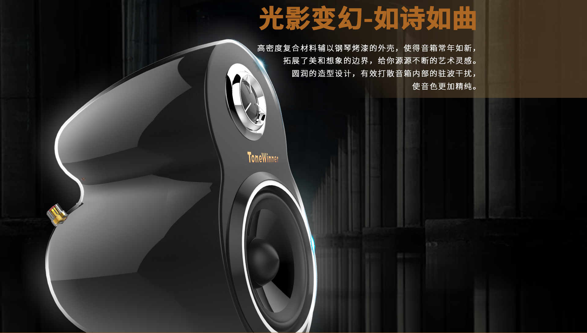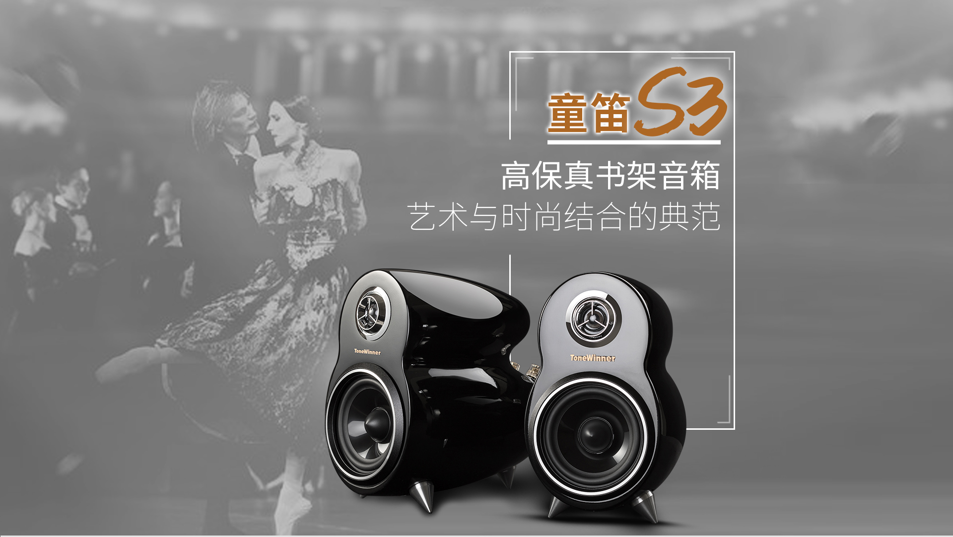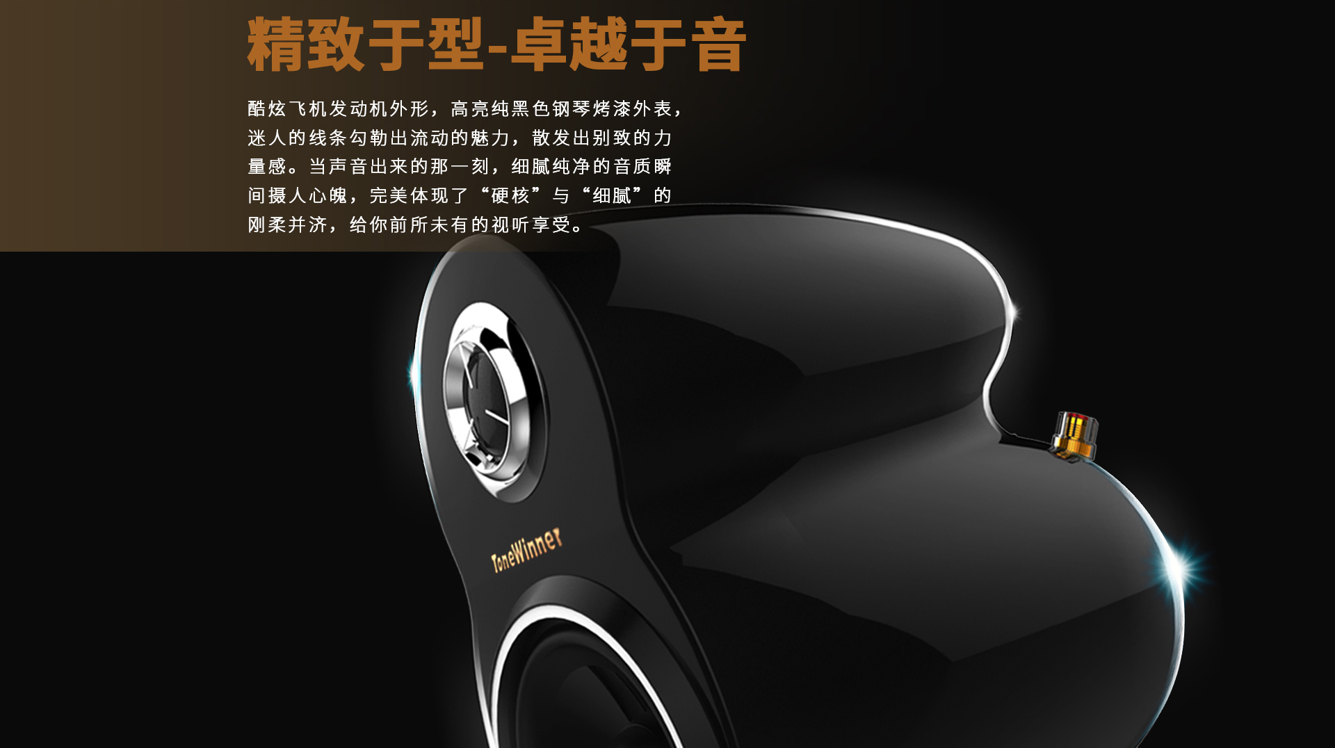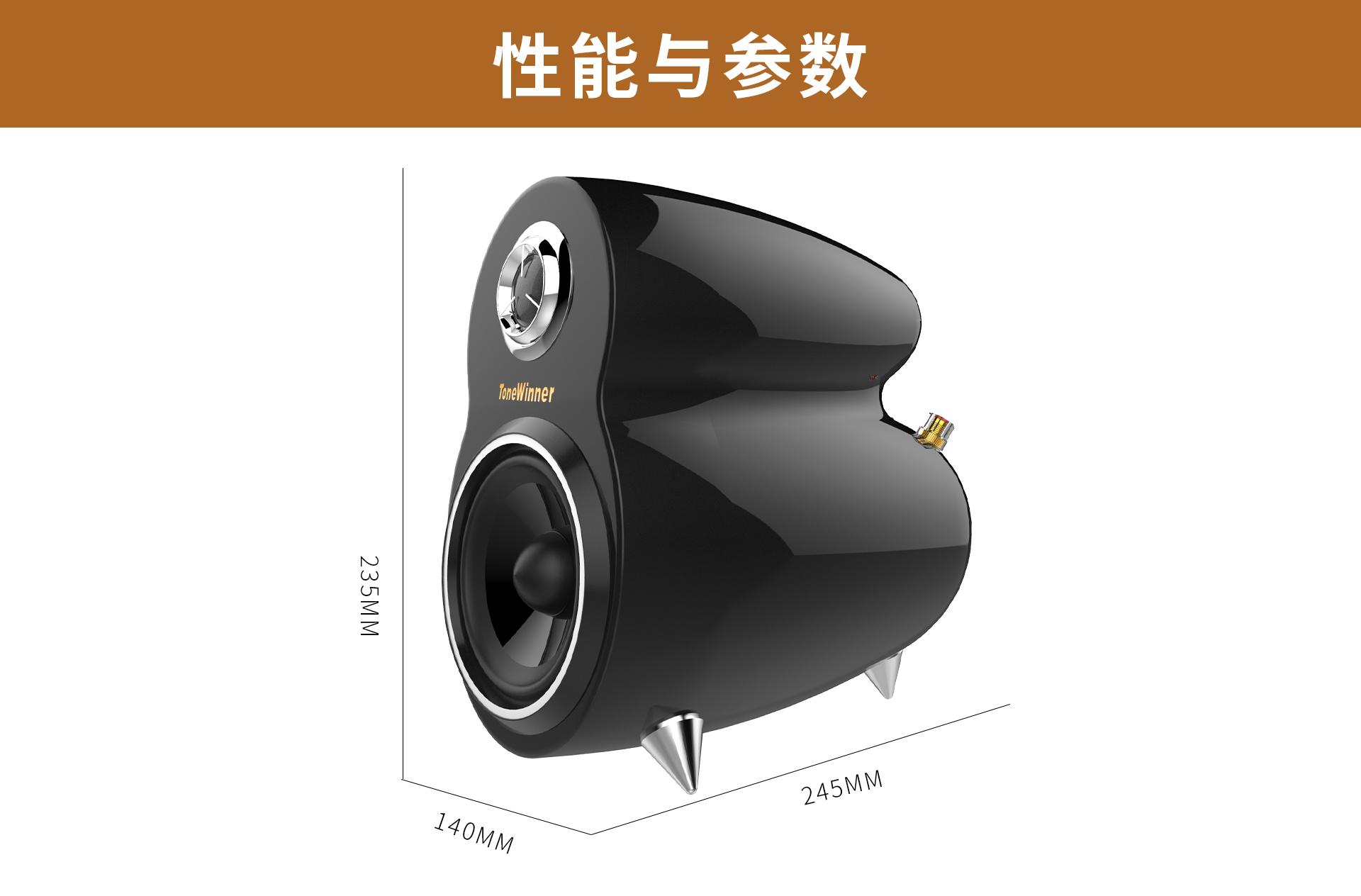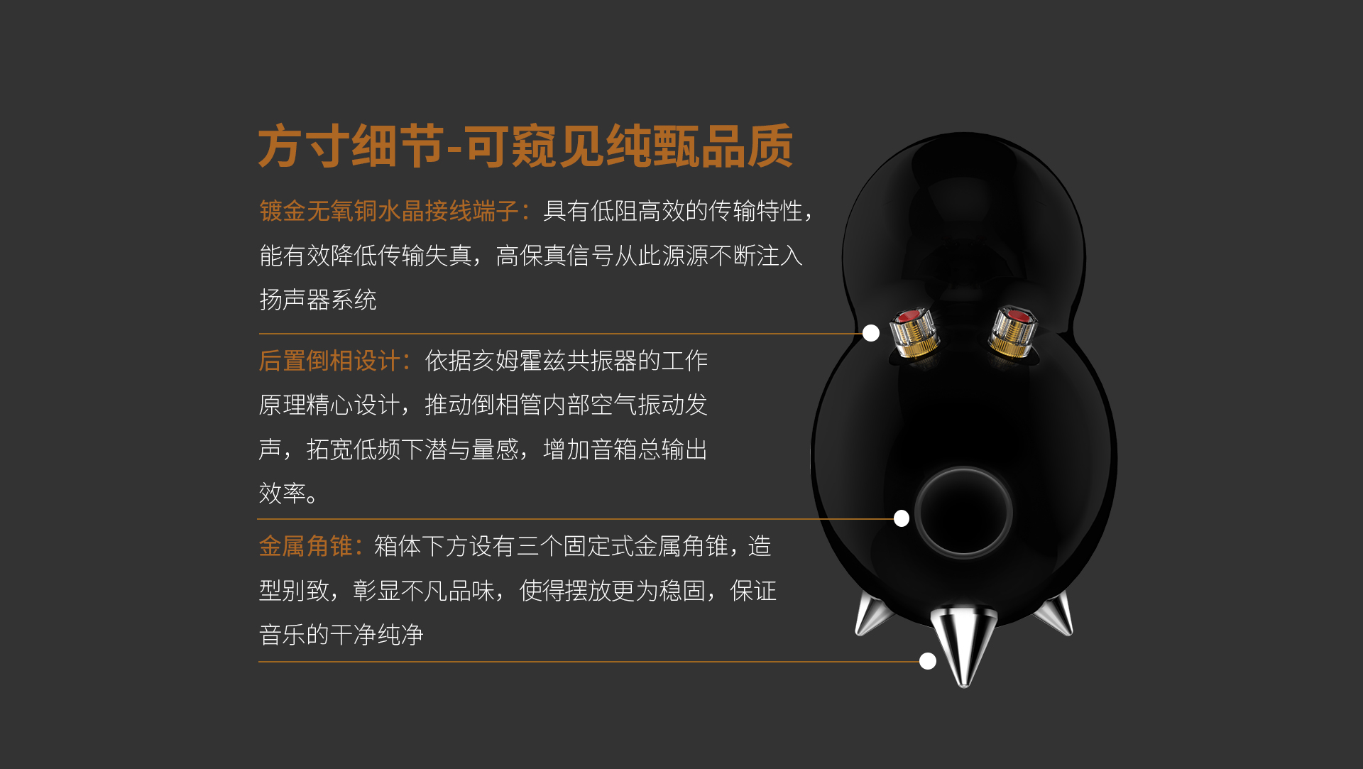 一、外觀特點 童笛S3早期專供歐洲市場,目標市場為歐洲一些有著濃郁后印象主義及抽象派雕塑情結的年輕人群。外觀為雙子彈頭堆疊狀設計,通身覆以高亮純黑的鋼琴烤漆,再經過重重打磨拋光而成。整個箱體敦實凝練,外表光滑細膩,在光源下線條優雅流暢,如一尊整體澆鑄、精雕細刻出來的后印象主義雕塑作品,散發著迷人的魅力。底座為三根精細打磨的金屬圓錐腳釘,三點著地可以很好地穩固箱體,錐頭被打磨地珠圓玉潤,能夠防止在家具上留下劃痕。整體造型美觀大方,時尚而富有特色。