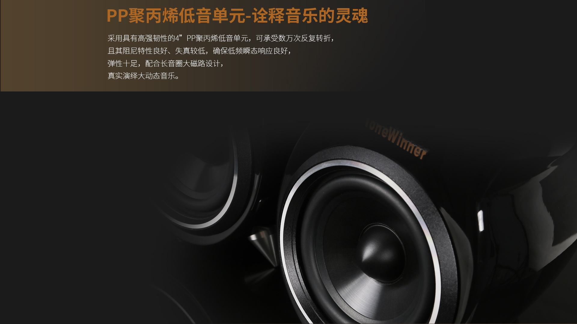 二、單元選擇 高音喇叭是來自德國的3/4寸HI-FI專用球頂絲膜軟高音,天然蠶絲球頂振膜配合天然大磁鋼、超大音圈,使得高音單元頻響優秀,細節表現豐富、指向性明確。蠶絲膜外層罩了一個高亮鍍鎳三幅高音均衡器,除了可以很好地保護蠶絲膜不受外力撞擊受損,最主要的作用是有效優化高音的頻響曲線,使得高音具有更加豐富多元的泛音,讓高頻更加細膩通透、清爽干凈。 中低音單元采用聚丙烯PP盆4寸HI-FI專用中低音喇叭。PP盆振盆一致性好、不易受潮變形,同時有敏度高、失真低的特性,能夠輕松駕馭功率輸出不大、阻尼系數一般的小型功放。 中低音喇叭單元錐盆中部的防塵帽設計成了子彈頭狀,目的是對喇叭發出聲波的相位進行干預和修正,拓寬中高音頻信號的擴散角度,讓中高頻聲波能夠在更寬闊的空間內進行傳播,從而令喇叭發聲的聲像定位精準,防止駐波和交越失真現象出現。
