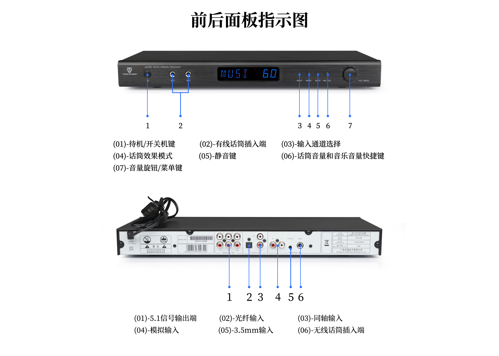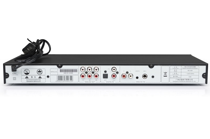 一、產品介紹 AD-308是天逸近年推出的一款高性能、多功能卡拉OK效果器,采用專業級DSP數字處理,內置高反饋抑制模塊,9級數字防嘯叫,讓音質更純凈,演唱更輕松。支持3.5mm、模擬、同軸和光纖等音源輸入,5.1卡拉OK輸出接口。更專業的設計,滿足你的個性化需求,“將KTV搬回家。” 二、功能介紹 1、專業DSP卡拉OK算法,多種話筒音效調節。 2、9級數字防嘯叫,音質更純凈。 3、支持3.5mm、模擬、同軸和光纖等音源輸入。 4、多功能紅外遙控器。 5、支持3路話筒輸入(2組有線,1組無線) 三、產品性能參數 信噪比:音樂:≥80db (A計權);話筒::≥80db (A計權) 頻響:音樂: 20Hz—20KHz;話筒: 20Hz-17KHz 增益:音樂: 15士3db 話筒: 35土3db 諧波失真:音樂:≤0.05% (A計權);話筒: ≤0.1% (A計權,正常工作條件下) 整機尺寸:431X51X199 mm 凈重:1.8Kg 電源電壓:~220V/50Hz 功耗:10W 隨機附件:說明書X1本Q-431影音四頭線X1條 遙控器X1個 電池X1對 合格證X1張 |
