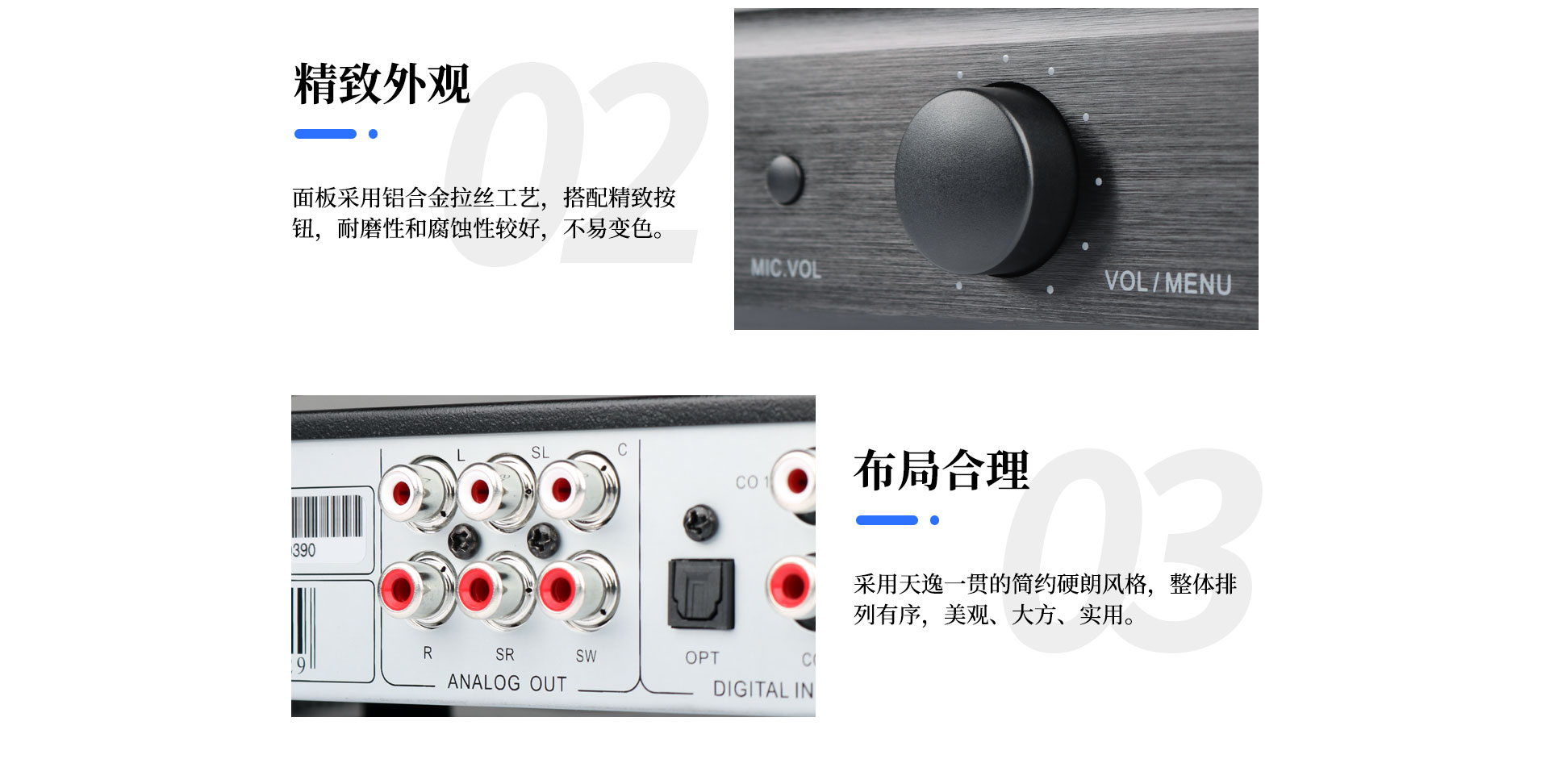 | 失真度:音樂:≤ 0.05%(A計權); 話筒:≤ 0.1%(A計權,正常工作條件下) | 頻 響:音樂:20Hz~20KHz;話筒:20Hz~17KHz |