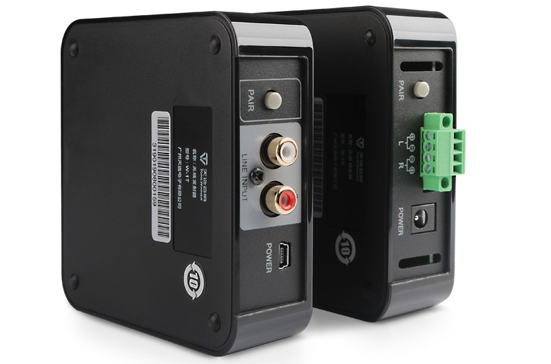 三、使用方法 W-1T提供LINE OUT(模擬L/R音頻)輸出,W-1R采用專業鳳尾接口,操作使用都非常方便,具體使用方法如下: 1.將W-1T與功放、CD機的信號輸出端口相連,將W-1R與音箱相連接; 2.長按W-1T的PAIR鍵幾秒,藍色信號燈開始一慢兩快閃爍時,進入配對模式; 3.長按W-1R的PAIR鍵幾秒,藍色指示燈常亮起時,表示配對成功; 4.將收發器接通電源,即可投入使用。 收發器配對成功后,下次使用將自動進入配對狀態,非常方便。 W-1R可接受兩個信號,即可以連接兩個音箱。