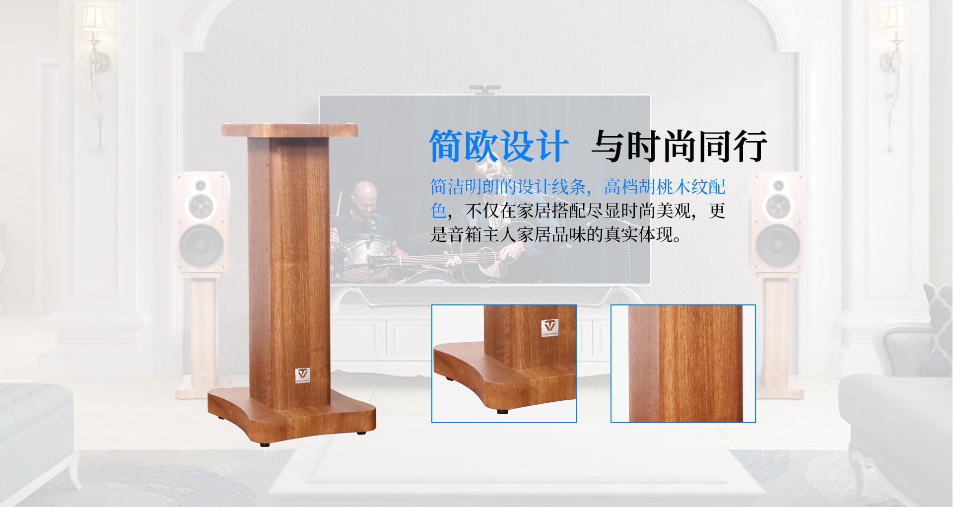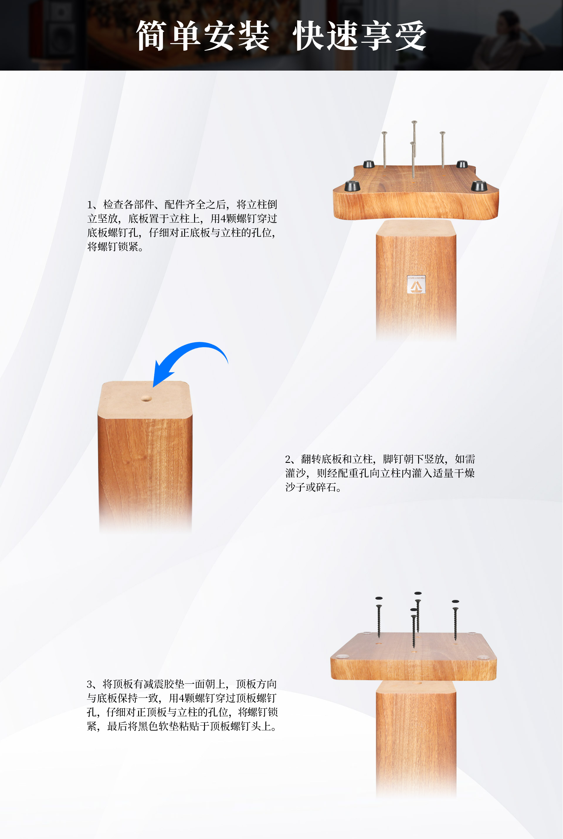 一、總體特點 1. 胡桃木紋外觀,設計簡約,優雅時尚,與家居百搭,彰顯高端品味。 2. 采用MDF加厚板材,其頂板厚達25mm,底板更是厚達43mm,堅固耐用,穩重大氣。 3. 空心立柱可通過灌入干燥的沙來增加重量。不僅能讓腳架變得更加穩固,也可以有效地干涉音箱與腳架的總體諧振狀況。同時,可以根據灌沙的總量創作出自己喜歡的聲音,亦使聲音更加純凈,還原最真實的Hi-Fi之聲。 4. 618mm黃金比例腳架總高度,視覺上極具美感,更是聽覺上的盛宴。 5. 精確計算的高度能與大多數書架音箱配合,使其高音單元與聽眾坐下后的耳朵高度基本保持同一水平。通過合理的高度及擺放方式,能讓聽眾獲得美好的聽音感受,呈現更多音樂細節。 6. 四顆高彈柔性防滑墊位于頂板上方,既能有效減少低頻共振,也能防止因低頻震動導致的音箱移位甚至跌落損壞。 7. 四只加厚減震機腳,能有效降低音箱諧振,起到柔化音質,提升音頻質感的作用;同時也有效避免地面潮濕對腳架造成損壞。 8. 安裝簡單快速,只需三步就能享受高保真Hi-Fi音樂。 9. 適用于多種場景,如:客廳、書房、臥室,選擇擺位靈活多樣。