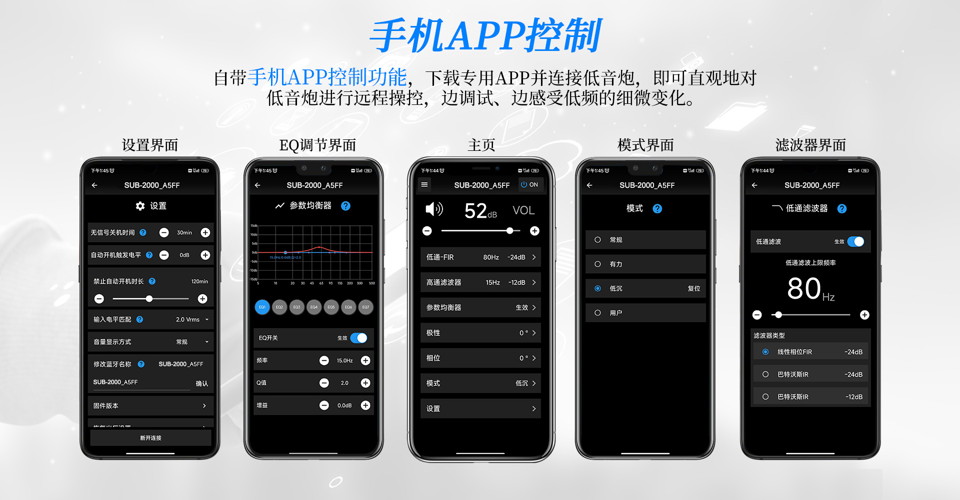 一、功能特點1、采用高效低噪D類放大電路,內置DSP數字處理器,7段參量均衡 (EQ) 任意調節 2、采用觸摸按鍵配合液晶顯示屏,調校一目了然; 3、實現APP遠程控制,操作更便捷; 4、實現APP無線操作程序升級; 5、內置低通濾波器,頻率范圍可調節; 6、內置相位開關,0°/180°相位切換; 7、支持平衡、RCA兩種輸入; 8、支持無信號待機功能; 9、12英寸、長沖程、強磁、大功率喇叭單元,具有低失真、高動態長沖程等特點; 10、雙導流、下潛反射式倒相口, 強勁有力,低頻更足。