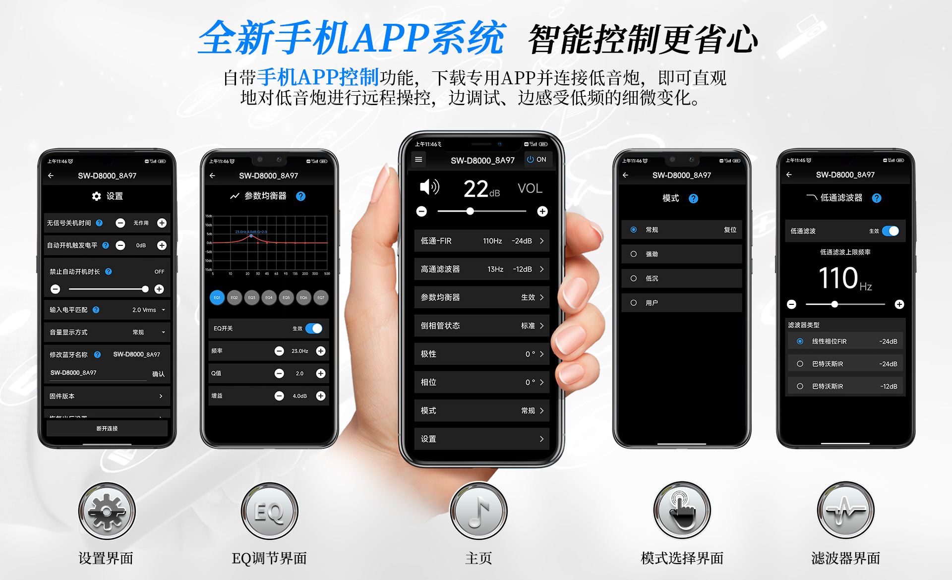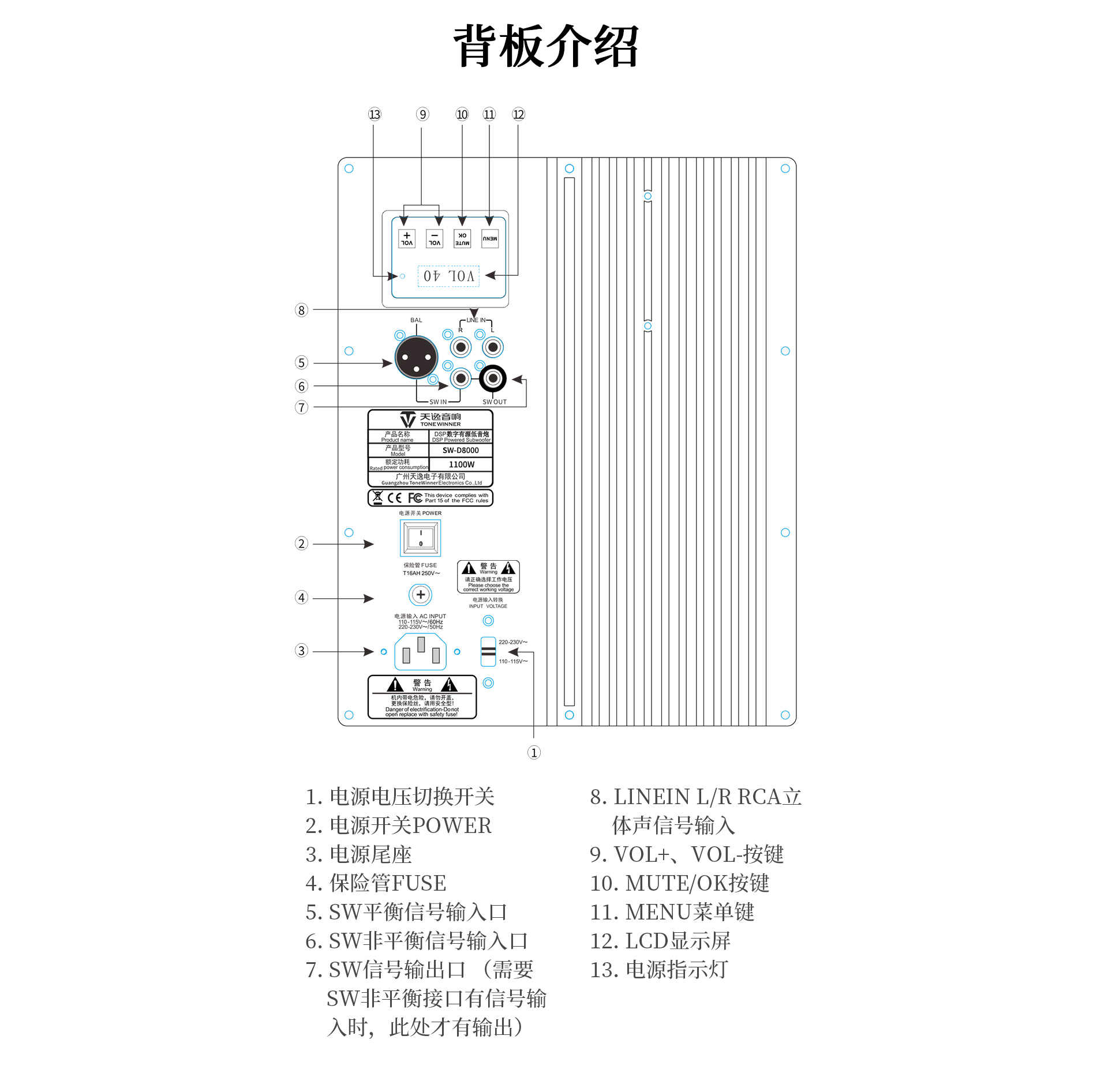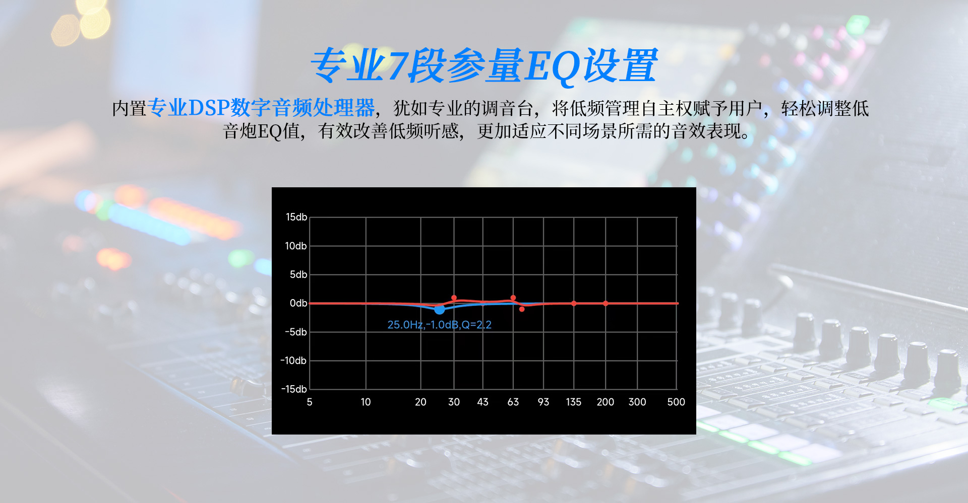 一、 功能特點 1. 采有高效低噪D類放大電路內置DSP數字處理器,7段參量均衡(EQ) 任意調節 2. 雙15英寸、長沖程、強磁、大功率喇叭單元,具有低失真、高動態長沖程等特點; 3. 雙磁鋼設計,喇叭輻射效率更高更穩定; 4. 采用觸摸按鍵配合LCD液晶顯示屏,全功能觸控設計,調校一目了然; 5. 實現APP遠程控制,操作更便捷; 6. 實現APP無線操作程序升級; 7. 四種低頻模式,根據聽音偏好進行個性化調節 8. 內置高低通濾波器,頻率范圍可調節; 9. 內置相位開關,0°/180°相位切換; 10. 峰值功率P-P輸出可達8000W,重量高達68公斤; 11. 支持無信號待機功能; 12. 支持平衡、非平衡、RCA立體聲信號; 13. 前置五個倒相孔,支持倒相箱、閉箱設計;