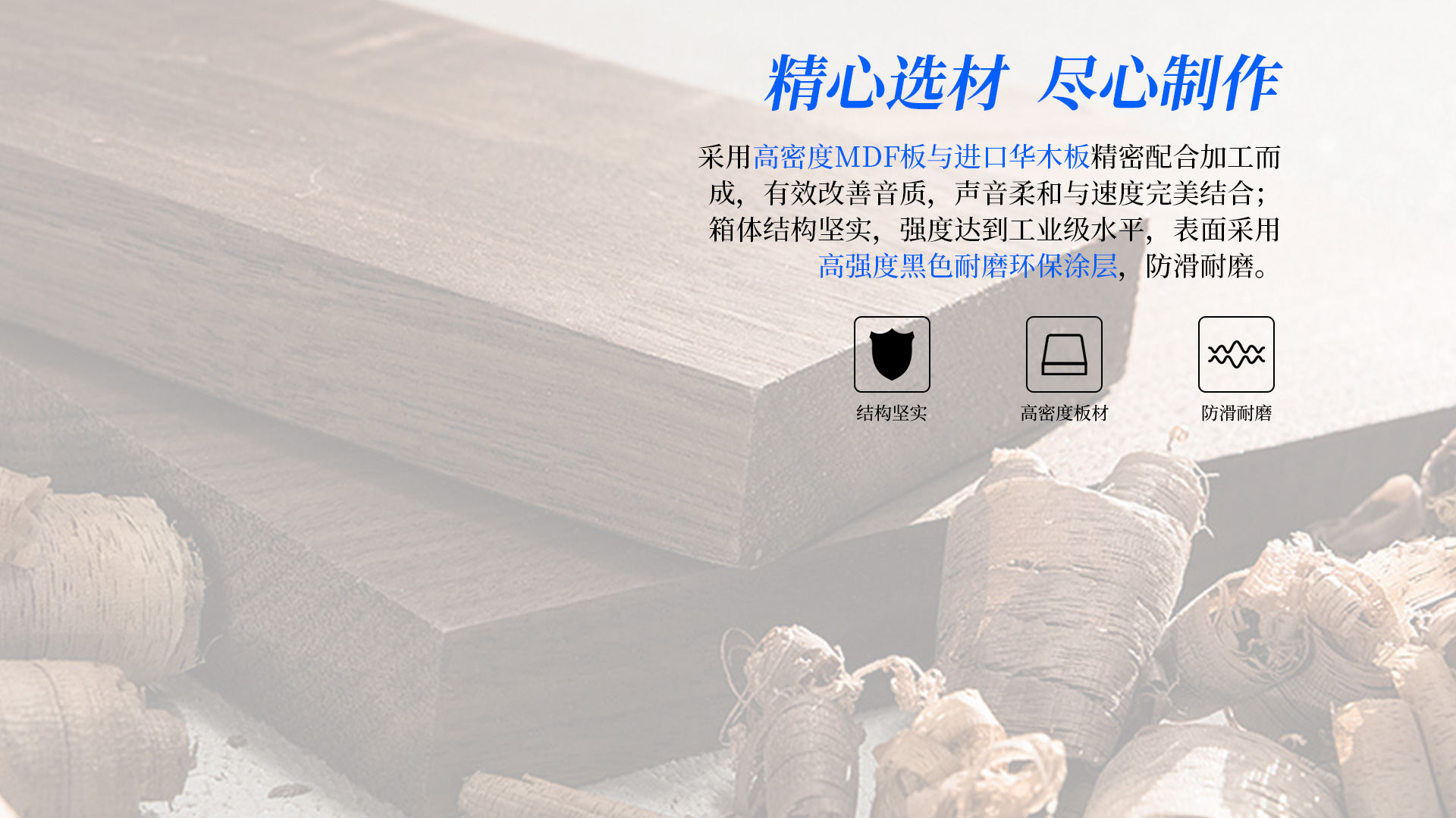 一、 外觀特點 箱體采用高密度MDF板與進口華木板配合加工而成,箱體結構結實,外覆高強度,鋼制沖壓一體成型的網罩,防滑耐磨,美觀大方。