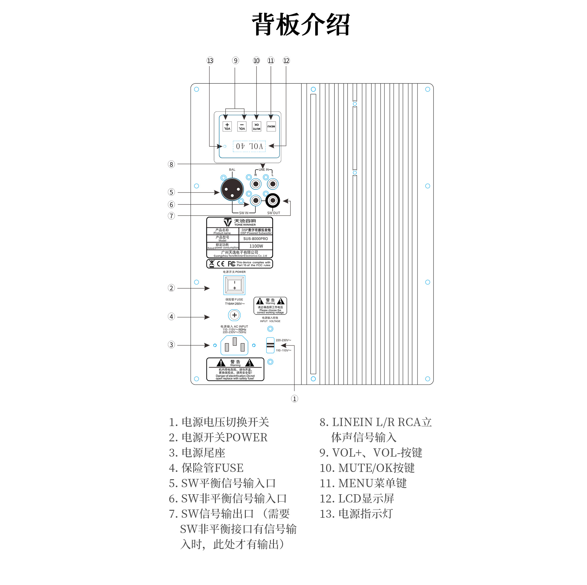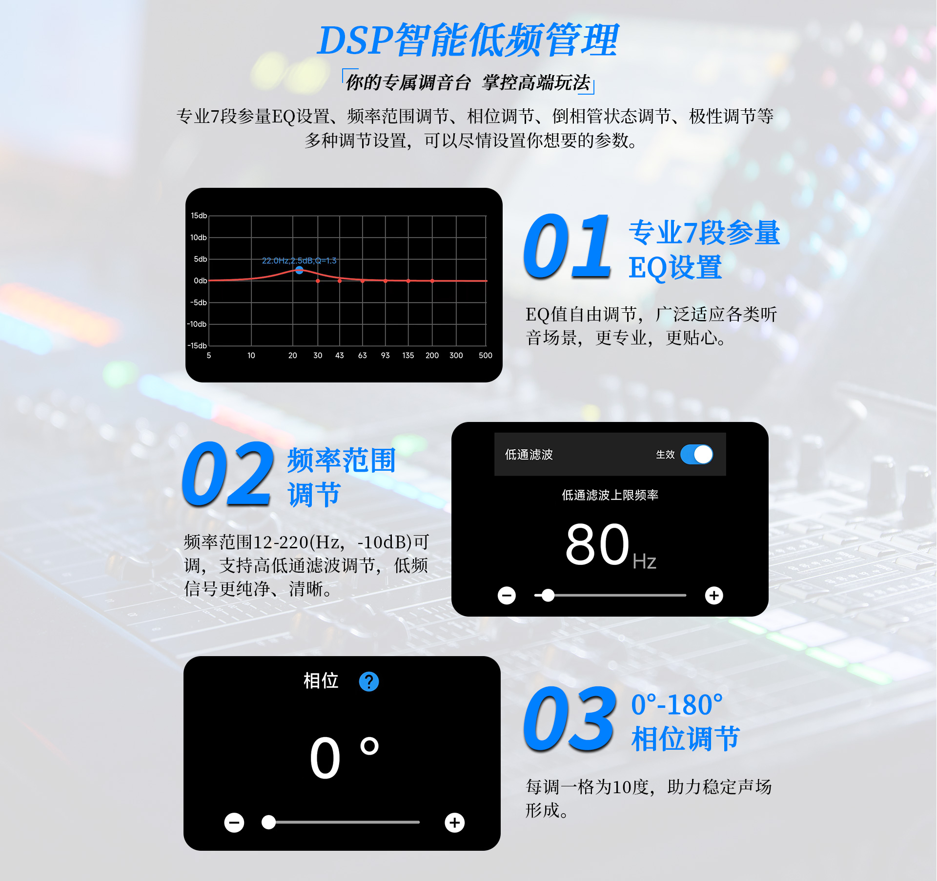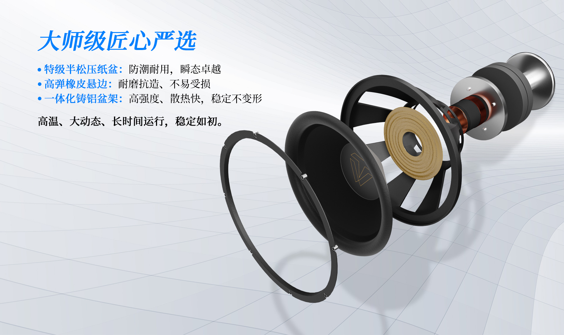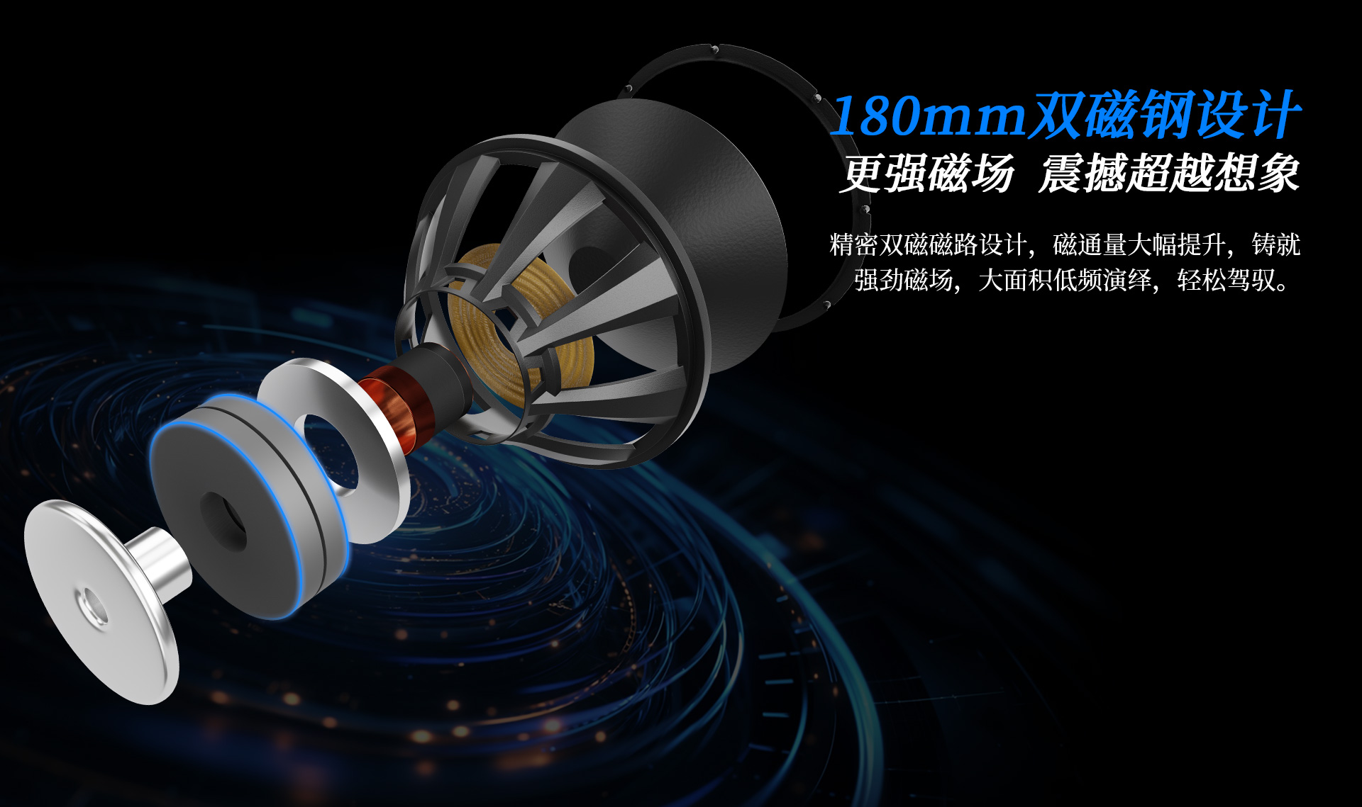 一、功能特點 1. DSP智能低頻管理:7段參量EQ設置、頻率范圍調節、相位調節; 2. 雙15吋喇叭、長沖程、大功率喇叭單元; 3. 功放功率達1500W(3Ω),峰值功率P-P輸出可達8000W,重量高達85公斤; 4. 180mm雙磁鋼設計,喇叭輻射效率更高更穩定; 5. 采用觸摸按鍵配合液晶顯示屏,調校一目了然; 6. APP智能操控系統,實現遠程操控,實時反饋; 7. 內置低通濾波器,頻率范圍可調節; 8. 支持平衡、非平衡、RCA立體聲信號、低頻信號輸出; 9. 支持無信號待機功能; 10. 前置六倒相孔設計,支持倒相箱、閉箱設計; 11. 四種低頻模式,根據聽音偏好進行個性化調節; 12. 天逸專利電源管理技術,滿足全球電網電壓設計; 13. 橫放、豎放兩種擺放模式,根據環境調節。