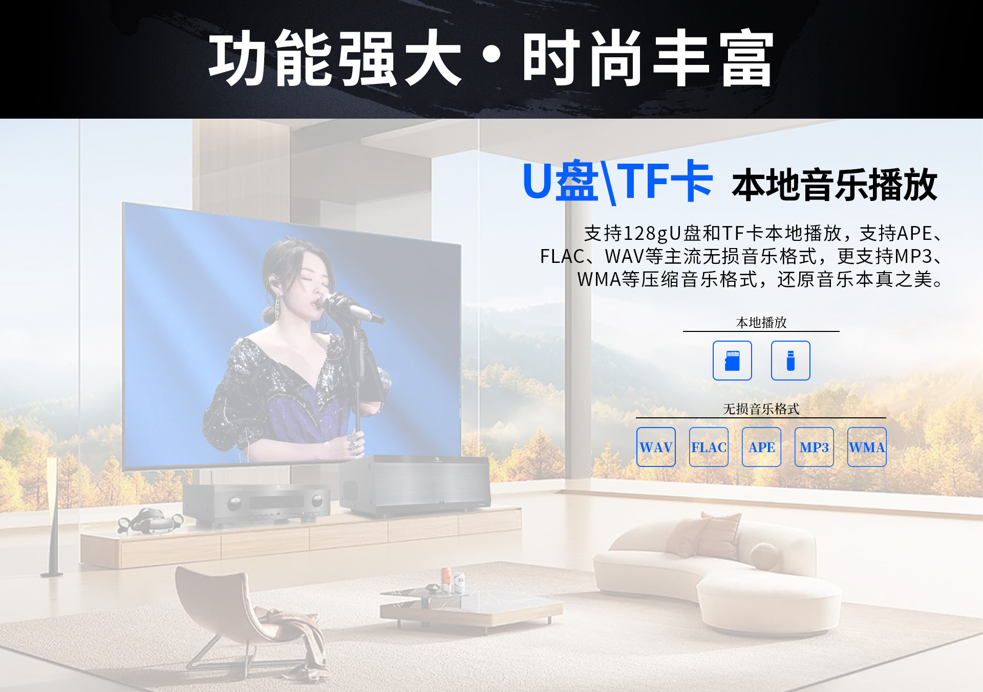 | 適用場所:影吧、影K、多媒體會議室、娛樂活動中心、接待室等影音間 | 隨機配件:說明書、遙控器、HDMI線、影音四頭線、電池、兩芯電源線、合格證 |